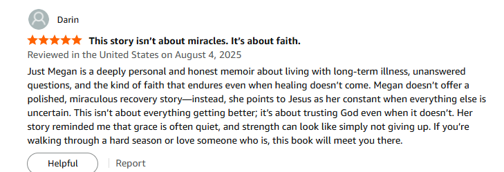 For twenty years, Megan lived with an undiagnosed disease, facing seemingly insurmountable challenges. Her story, told in Just Megan, isn’t a tale of big miracles or decisive victory. It’s a testimony to how God shows up even when the problems don’t go away. It’s a story of miracles that sustain rather than rescue. It’s about discovering a God who provides abundant life.